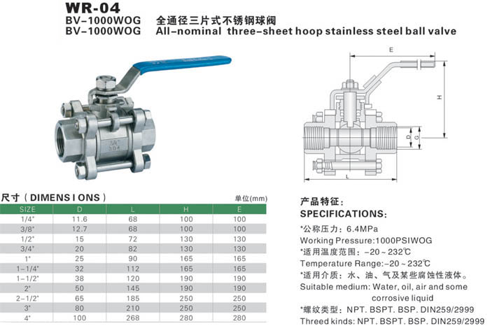 全通径三片式不锈钢球阀